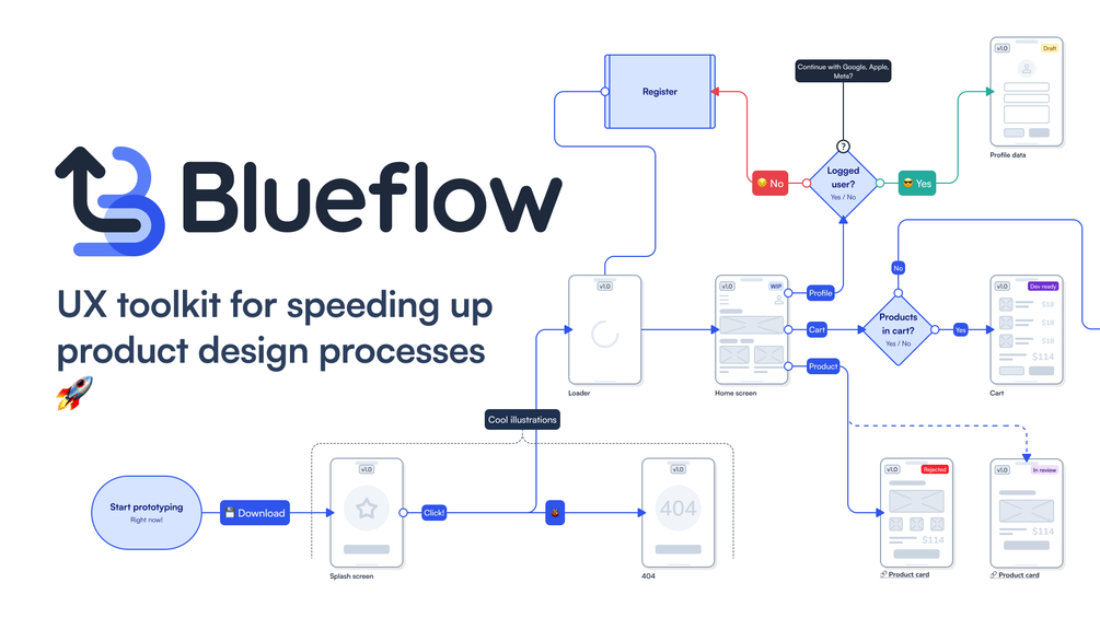 Blueflow will help you with product design processes. From the very early stage of drafts and wireframes to validate scenarios and statuses of UX and UI progress.